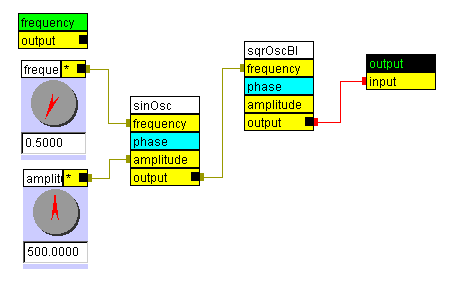 Connect the sinOsc output to the sqrOscBl frequency. Notice that this disconnect